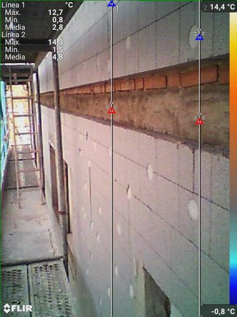 Por el proceso de montaje, se colocaron en primer lugar las placas de poliestireno (eps) en la fachada, en este momento y antes de colocar el aislamiento cortafuegos, realizamos una visita de obra para verificar los trabajos. Esta visita la realizamos llevando una cámara termográfica para comprobar la posible existencia de puentes térmicos, al ser un día muy frio y estar la calefacción central del inmueble a pleno rendimiento era un día muy propicio para su analisis.