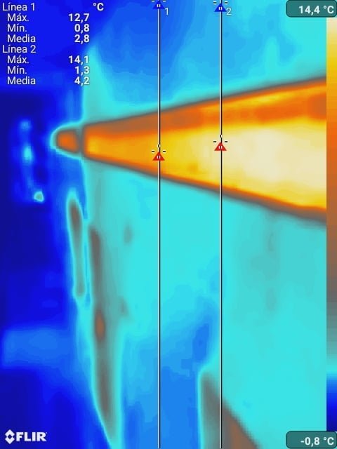 ¿Que significa esta diferencia de temperatura? simplemente, que la zona sin aislamiento la energía empleada para calefactar las viviendas, fluye a través del cerramiento con relativa facilidad, calentando el plano exterior. Para compensar esta perdida de energía y mantener una temperatura de confort interior razonable, es necesario generar de nuevo esta energía perdida mediante el funcionamiento de radiadores o climatizadores. En la situación de la fachada rehabilitada térmicamente la perdida de energía es notablemente inferior. No hará falta consumir tanta energía para generar el calor que compense las perdidas a través de ella.