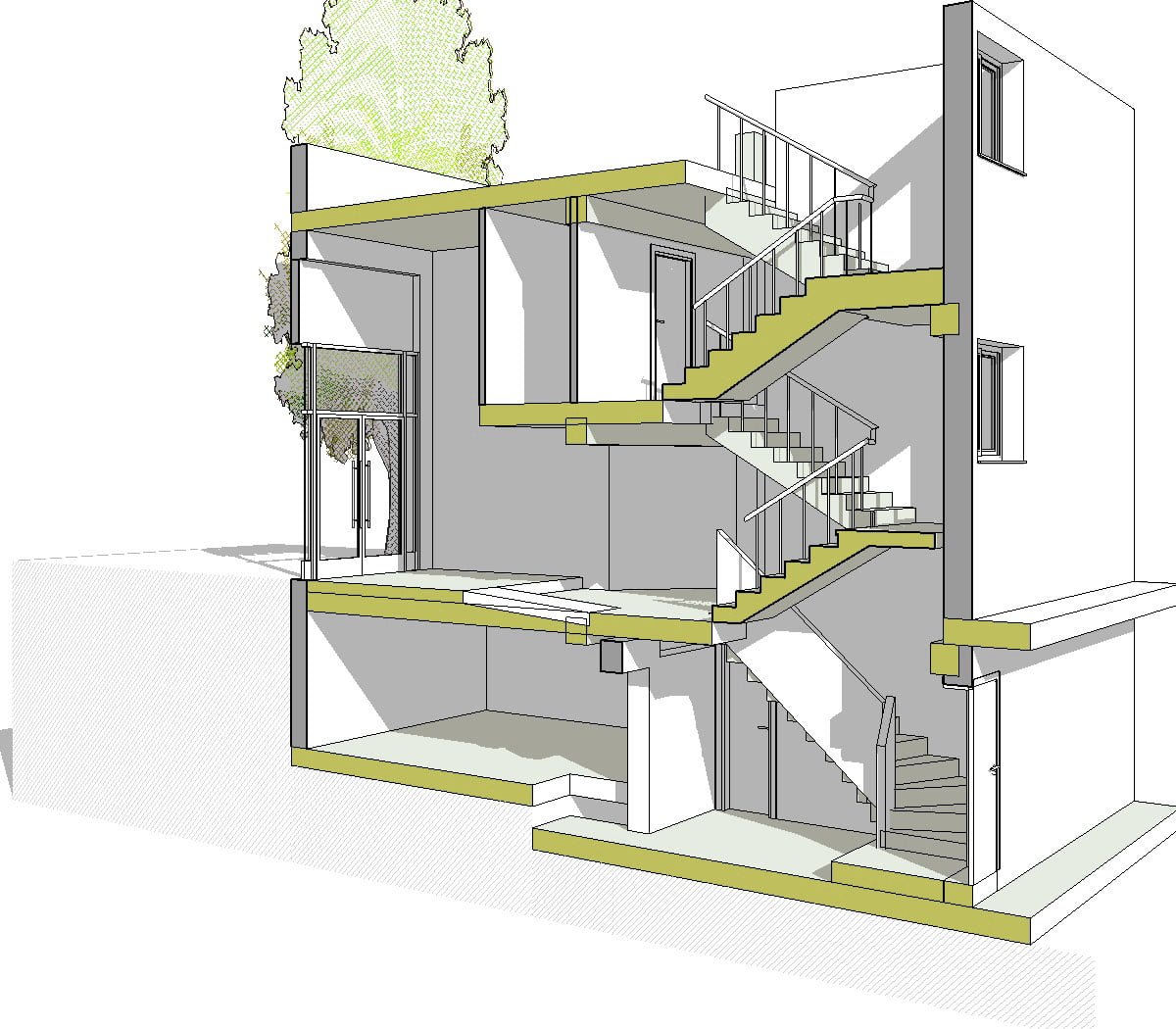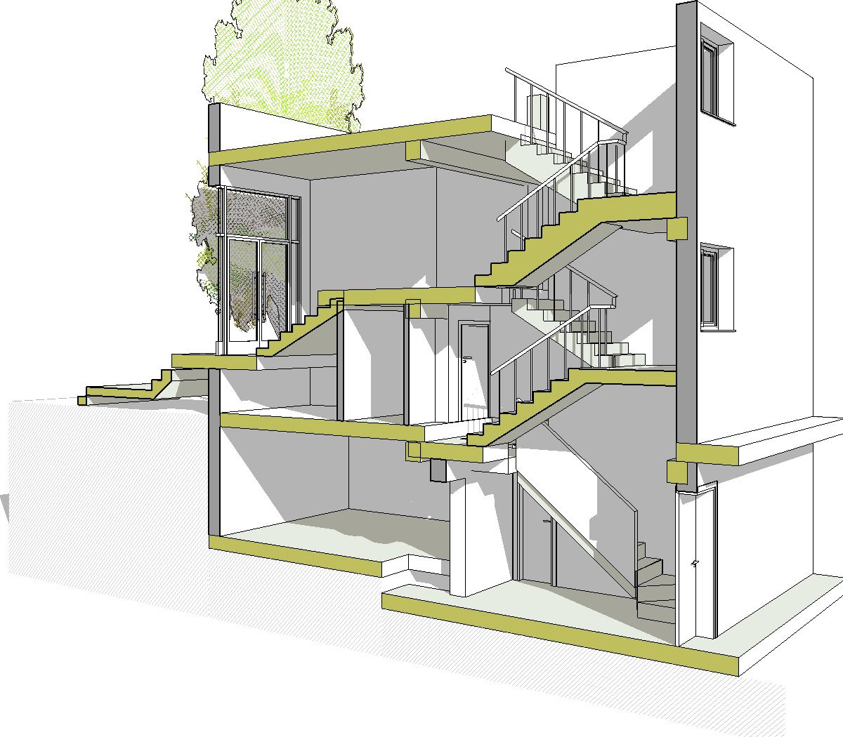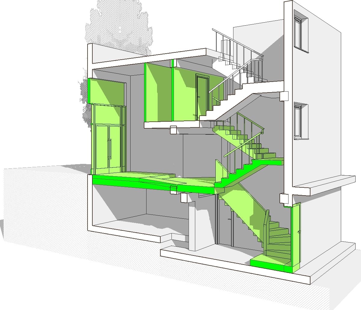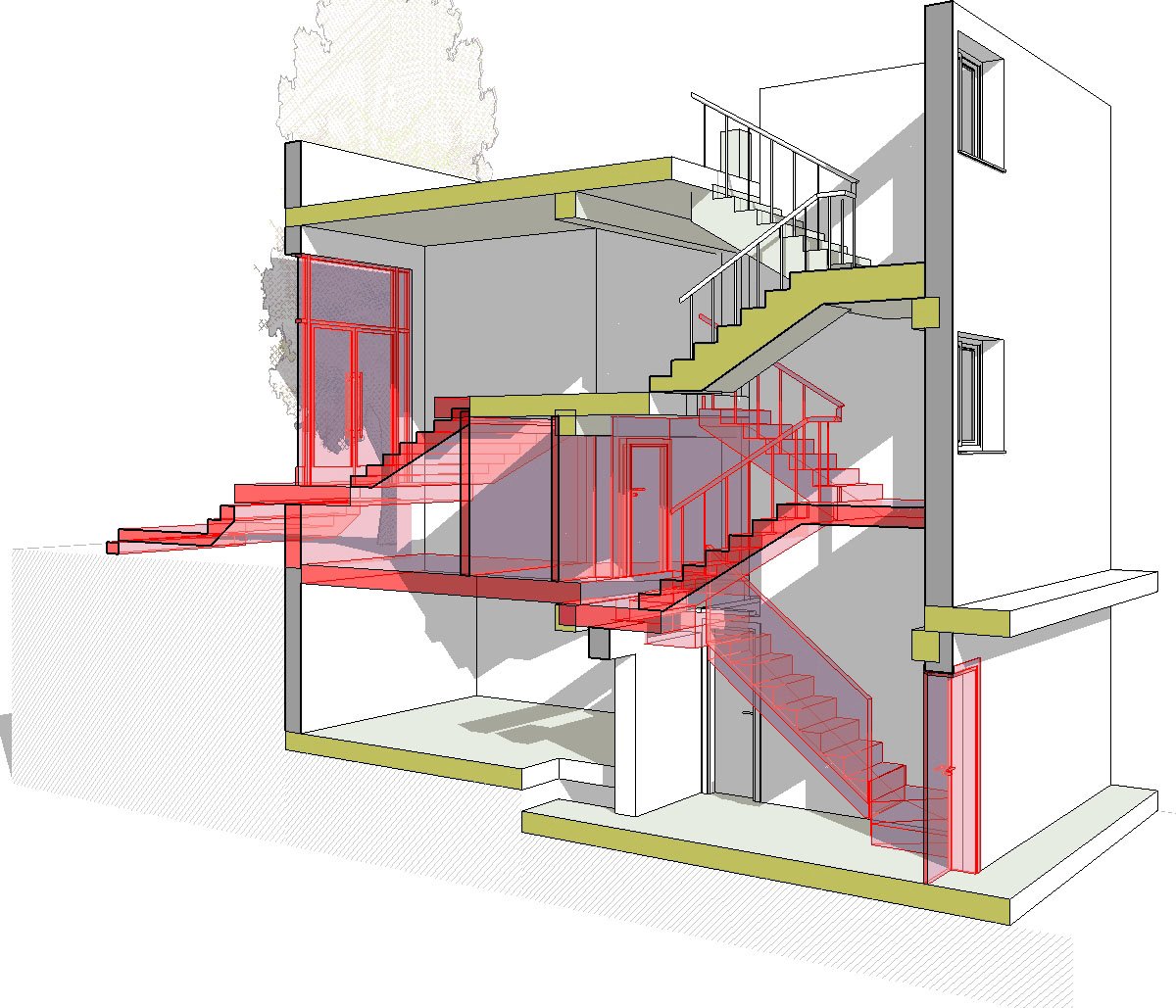 El análisis se planteo tridimensionalmente (con metodología Bim), de esta forma se pudo determinar de forma minuciosa cada una de las decisiones que se iban tomando de forma coordinada en los planos horizontales de circulación a la vez que en los elementos verticales, rampas, ascensor, escaleras,.. conociendo en todo momento las alturas libres de los diferentes espacios resultantes.